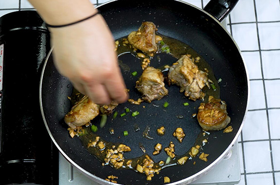 4、锅中留有底油,放入排骨、五香粉、椒盐粉和炸好的蒜蓉,中火翻炒均匀后再撒上少许葱花,可口的椒盐蒜香排骨便制作好了。