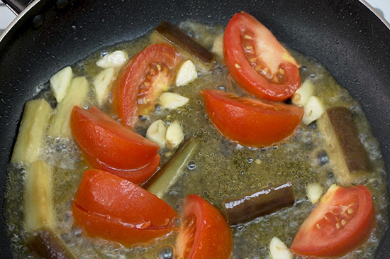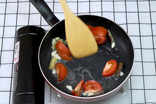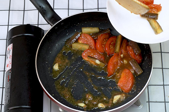 2、起锅烧油爆炒蒜片,倒入茄子,翻炒均匀后再倒入西红柿。