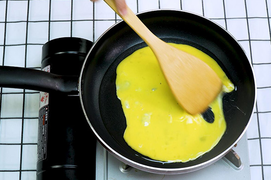 2、起锅烧油倒入鸡蛋翻炒均匀。