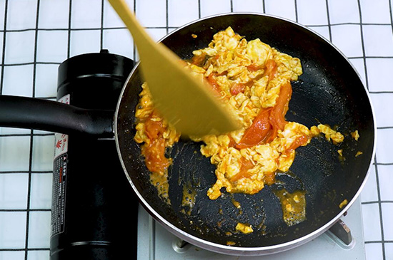3、将西红柿倒入翻炒,西红柿变软后加入食盐、番茄酱、少许糖翻炒均匀便可出锅食用。