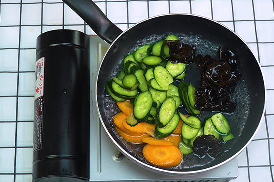 2、胡萝卜、黄瓜清洗干净后切成片状,与浸泡后的木耳一起焯水。
