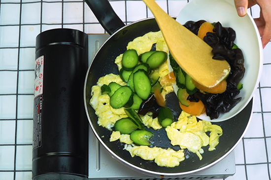 4、倒入黄瓜、胡萝卜、木耳翻炒均匀。