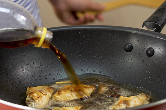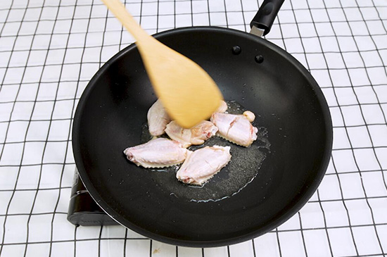 2、起锅烧油,放入鸡翅煎至两面金黄色,中途放入葱、生姜、八角翻炒,随后加入料酒。