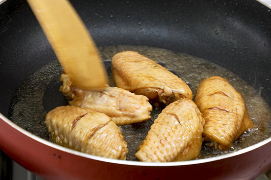 3、起锅烧油,放入鸡翅煎至两面金黄色。