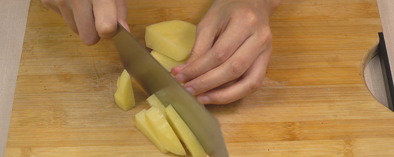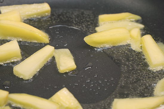 3、起锅烧油,放入土豆油炸至金黄色捞出。