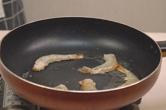 4、锅中留油放入虾炸至变色捞出。