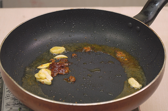 5、再次起锅烧油,将豆瓣酱、姜片、蒜片以及干辣椒放入爆炒。
