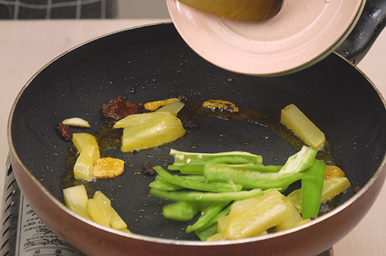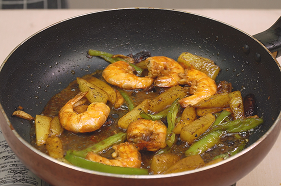 6、放入土豆、青椒翻炒后倒入虾。