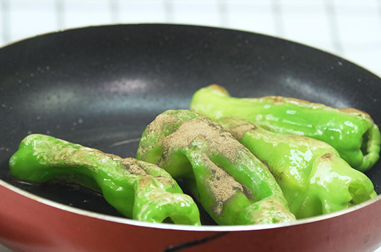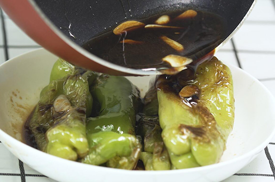 制作虎皮青椒时,可先将青椒清洗去头去瓤,起锅烧油,放入虎皮青椒,倒入花椒粉、醋以及生抽,最后加入适量的蒜片,大火收汁后即可出锅食用。