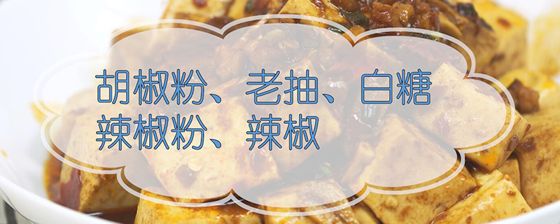 准备食材:豆腐、瘦肉末、食盐、食用油、葱末、蒜片、豆瓣酱、胡椒粉、老抽、白糖、辣椒粉、辣椒。