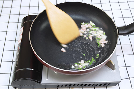 2、锅中倒入食用油、放入蒜、葱以及肉沫,炒至变色为止。