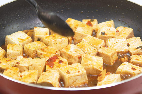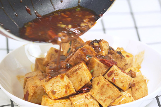 麻辣豆腐制作时需将白豆腐切成块状,焯水30秒钟,在锅中加入食用油、爆炒蒜、葱以及肉沫直至变色为止,加入豆瓣酱、胡椒粉、老抽翻炒均匀,注入清水煮沸后放入食盐、白糖,倒入豆腐中火煮沸加入辣椒等食材即可食用。