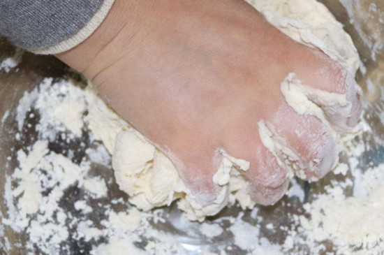 2、把面粉和适量盐、调和油、泡打粉与温水和成面团,用湿巾盖在上面晾置30分钟进行发酵。