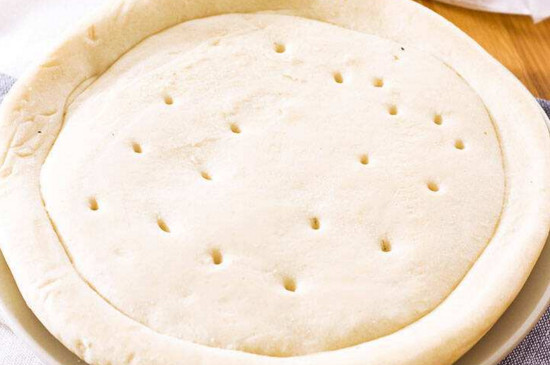 3、将发酵好的面团擀呈薄饼状,用叉子在上面插出若干小孔后,再往上面涂抹番茄酱、撒上切好的洋葱、青椒、奶酪或其它自己喜欢的辅料。