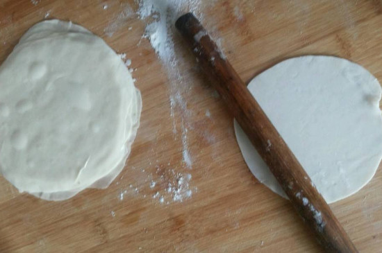 3、将发酵好的面粉团用擀面杖擀呈披萨一样的薄饼状,边缘略微向内卷起,用叉子在上面插出若干小孔。