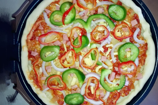 电饼铛制作披萨需要先把揉好面团晾置发酵一个小时,再用擀面杖擀成披萨一样的薄饼状,薄饼卷起边缘、表面插出若干小孔后,就可以放在刷好油的电饼铛上,依次铺好牛肉、鸡肉、青椒等辅料,最后用小火烤15分钟左右即可完成制作。