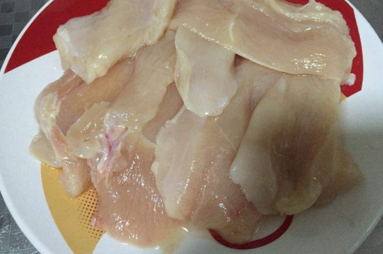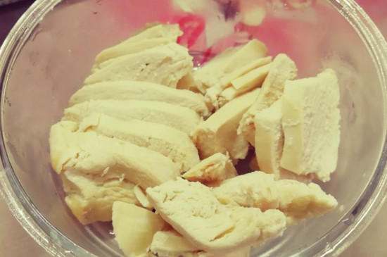 2、剥离鸡胸肉表层膜,再把鸡胸肉洗净并切成若干均匀条状。