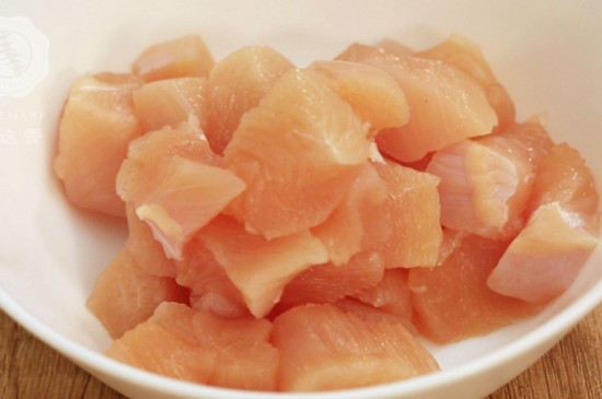 2、鸡胸肉洗干净切好后放入大碗内并加入淀粉,再往里面倒入一勺生抽、老抽数滴以及适量胡椒粉、孜然、盐,之后腌制3~5分左右。