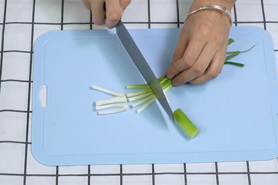 1、将蒜苗清洗干净,切成段状,豆腐切成小丁。