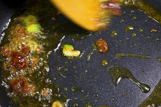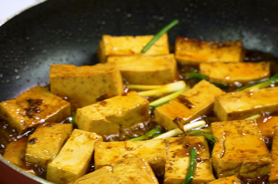 4、放入豆腐烧制入味,等水分快收干后加入蒜苗。