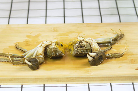 1、螃蟹清洗处理干净后,用刀切成两半。