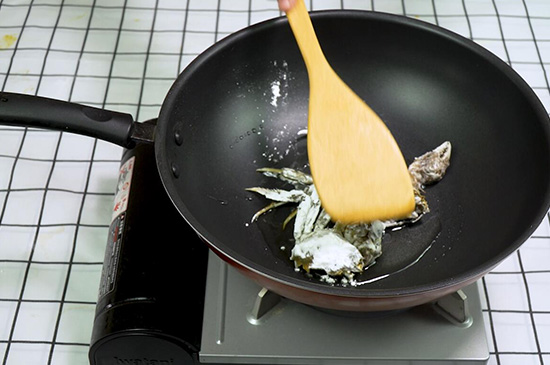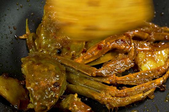 4、加入清水,放入炸好的螃蟹翻炒,加入食盐以及白砂糖调味。