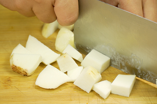 2、起锅烧油,油热后放入芋头块炸至表面金黄,再捞出盛好备用。