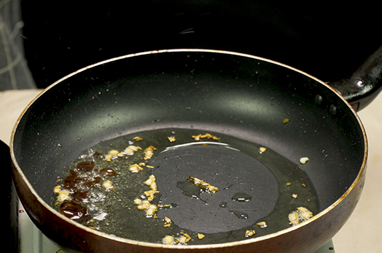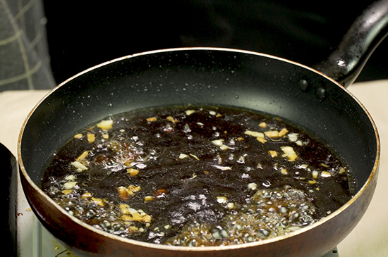 3、往锅内加入切好的蒜,用余油炒出香味后,加入蚝油、酱油、水、盐烧开。