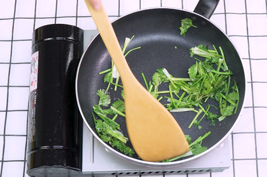 3、起锅烧油将香菜放入炒至半熟捞出备用。