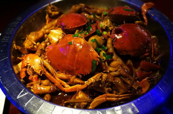 将斩开的螃蟹切口处粘上少许面粉,放到油锅中炸透,炸制金黄酥脆出锅。将买来的鸡爪对半切开,放在油锅中翻炒,并加入少许的盐、酱油、豆瓣酱炒香,加入清水炖煮20分钟。