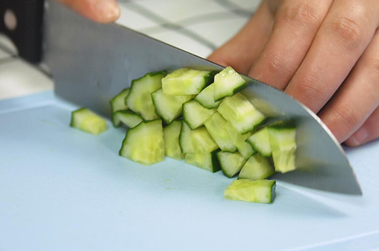 1、鸡肉、黄瓜、胡萝卜清洗后切成丁状。