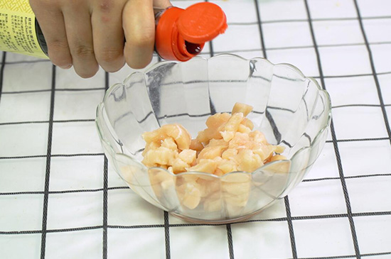 2、鸡肉装碗加入生抽、淀粉腌制15分钟。