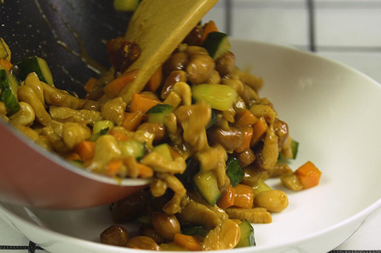 5、倒入黄瓜、胡萝卜丁以及调好的汁翻炒后加入油炸花生米即可出锅。
