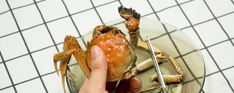 用剪刀将螃蟹的几只脚剪掉,放凉后蟹肉与蟹壳会自动分开。用剪刀将会蟹腿剪成三截,用最末一截的脚尖把蟹腿中的肉捅出来便能食用。