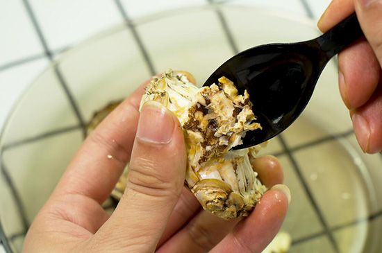 手拿住螃蟹的两边,微微用力,将螃蟹的肚子上的壳子挤掉,用勺子将中间的三角锥形蟹胃部分舀出轻轻吮吸后丢弃,切忌不要吸破蟹胃。