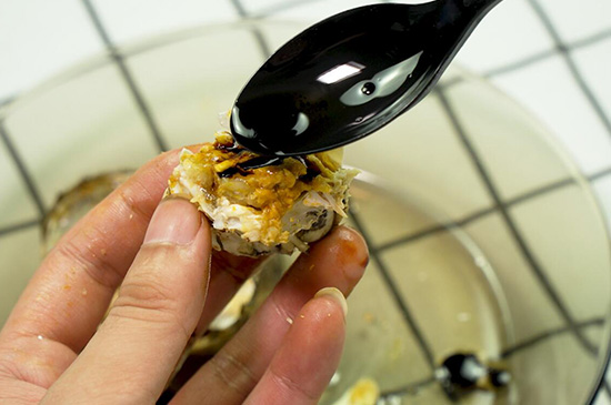把蟹掰成两半,用小勺舀点醋淋在蟹身上,将蟹黄以及蟹膏食用完。