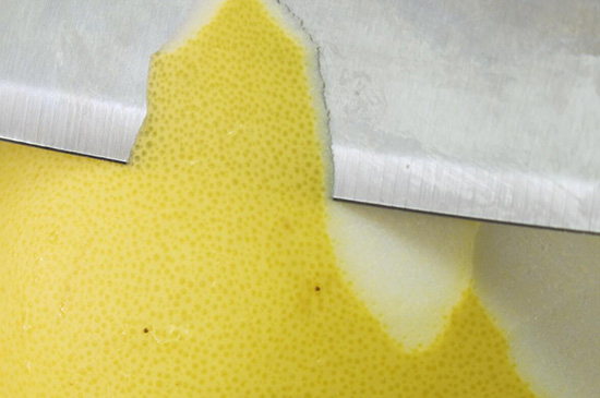 1、将柚子在热水中浸泡后沥干水分,用刀将黄绿色的薄皮刮下来,尽量要薄一些,少带里面白瓤。