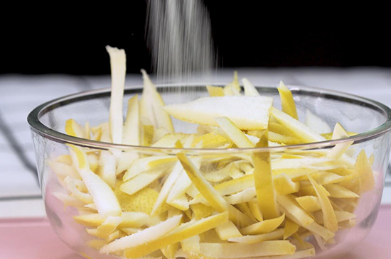 2、将柚子皮切成丝状,放入食盐腌制一下。