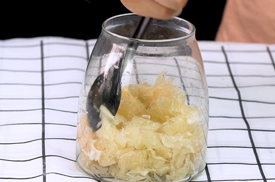 3、将果肉剥出,去除果核以及薄皮,用勺子将其捣碎,将处理好的柚子皮、果肉、冰糖放入干净的锅中,加入清水用大火煮开后改为小火,直至粘稠状关火,期间要不停的进行搅拌,避免粘锅。