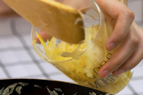 制作蜂蜜柚子茶时需将柚子用热水浸泡处理,用刀将柚子外层黄绿色的薄皮刮下,尽量要薄一些,少带里面白瓤,将柚子皮切成丝状,用食盐腌制后与果肉、冰糖放入干净的锅中熬煮至粘稠状,冷却后装入瓶中再放入冰箱中冷藏储存即可。