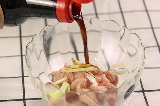 3、把肉放入碗中,加入切好的生姜、葱,再加入生抽、生粉抓匀腌制一会。