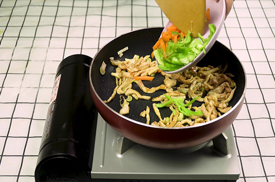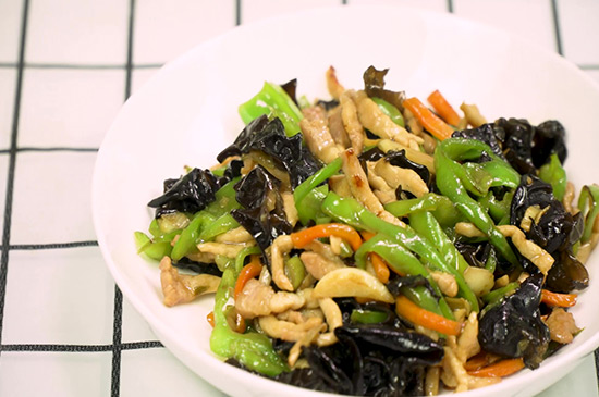 5、翻炒至肉丝变色,加入胡萝卜、木耳、青椒继续翻炒。