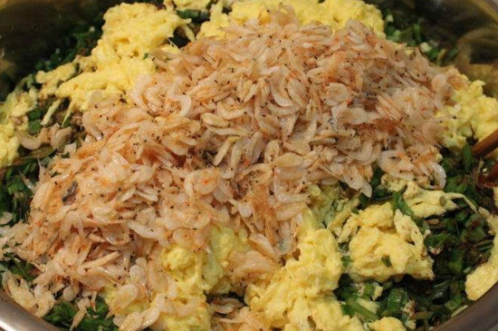 虾皮口感咸鲜,加在韭菜鸡蛋馅中能使口味更佳丰富。虾皮中含有蛋白质和虾青素,虾青素具有抗氧化的作用,经常食用能增强人体抵抗力,还能延缓衰老。