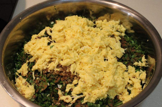 将韭菜与炒熟的鸡蛋充分混合均匀,先不要放盐,后放盐为佳,能防止韭菜在盐的作用下开始出水,导致韭菜馅不香。若在包的过程中韭菜馅少量出水,可以选择将水控出,可以增加食用口感。