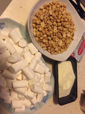 1、准备材料:棉花糖300g、奶粉200g、黄油100g、花生碎300g。