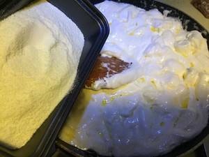 3、搅拌至融化时加入奶粉,继续搅拌均匀。