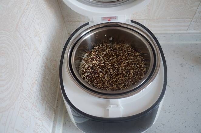 3、将大米和藜麦淘洗干净,放到脱糖电饭煲的小箅子上。