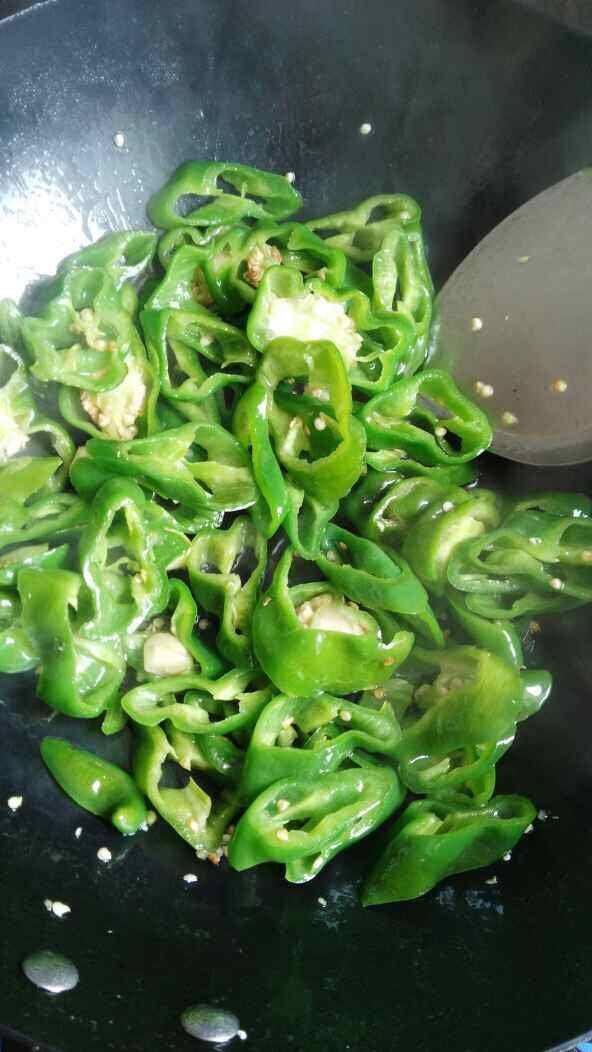 3、热锅放油,放螺丝椒和大蒜籽爆炒片刻。