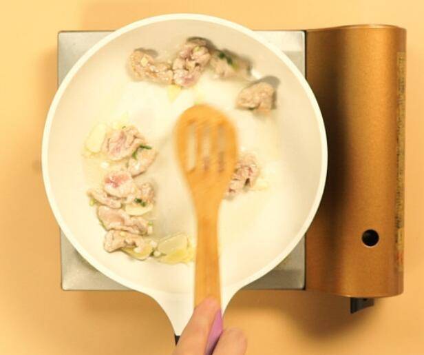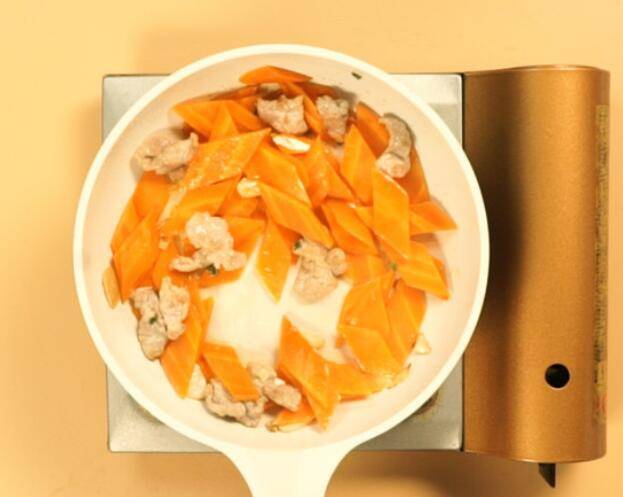 4、起锅倒入油5毫升,倒入葱姜蒜,倒入肉片,煸炒至变色倒入胡萝卜,翻炒均匀后放入胡椒粉、生抽、盐。