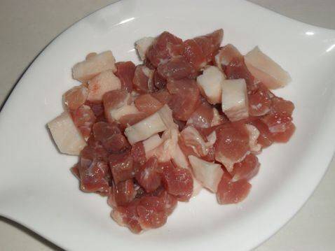 2、猪肉也切成小丁。